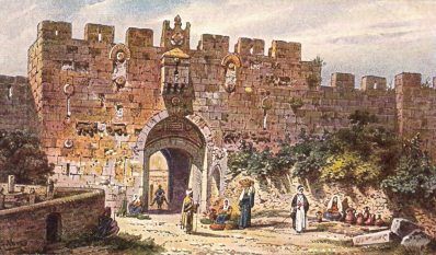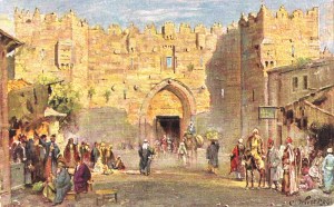 The travelers and their escort reached the gates of Jerusalem on the following afternoon. Simeon and his men went right in, but the travelers had to wait an hour before they were allowed in, and then they had to stay in the gate. They had room to set their tents and build a fire, and men brought them food and fodder for the horses and mule, but they would not be allowed to visit the city.